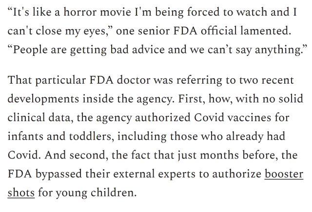 As you look through this, please keep in mind that the FDA has approved three doses of these mRNA vaccines for administration to all of our 5-11 year old children. Under emergency use authorization, of course. Even though there is no medical emergency.